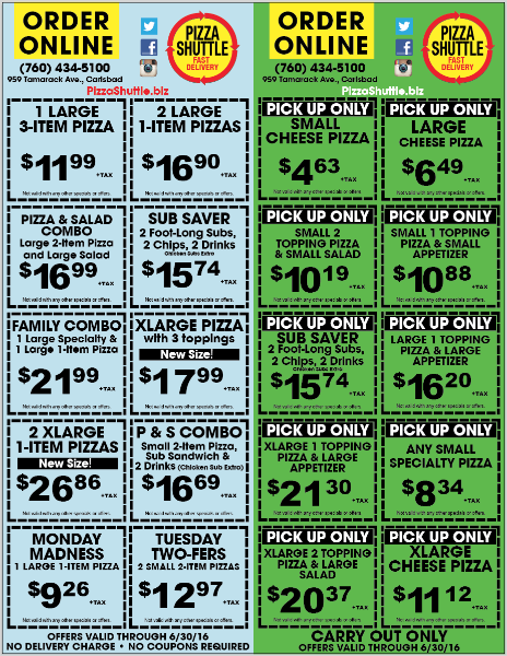 Monday Madness 1 Large Pizza with 1 Topping $ 10.00 Two-fer Tuesday 2 Small Pizzas with 2 Toppings $ 14.00 Wild Wednesday 2 Small Pizzas with 1 Topping $ 12.00 Three Top Thursday 1 X-Large Pizza with 3 toppings $18.00
